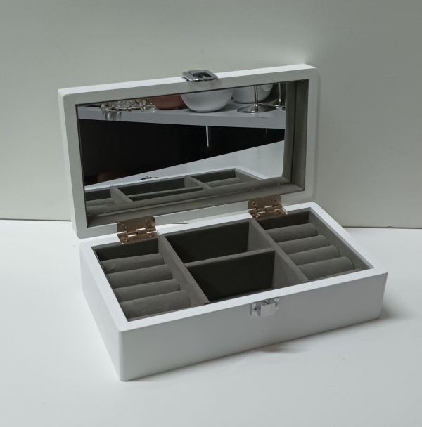 GUARDA-JOIAS BRANCO, COM ESPELHO POR DENTRO E DIVISÕES PARA OS ANEIS E BRINCOS