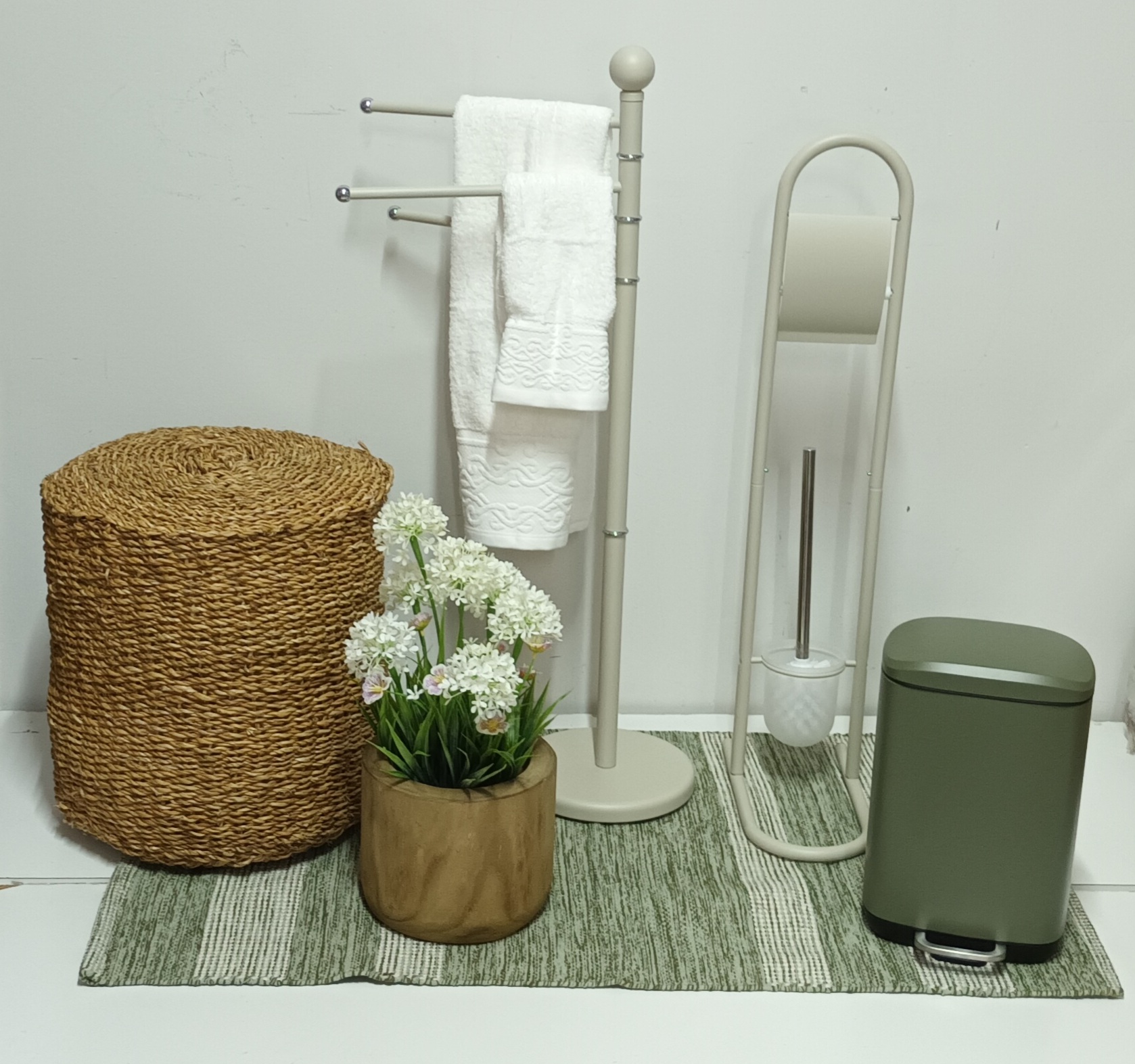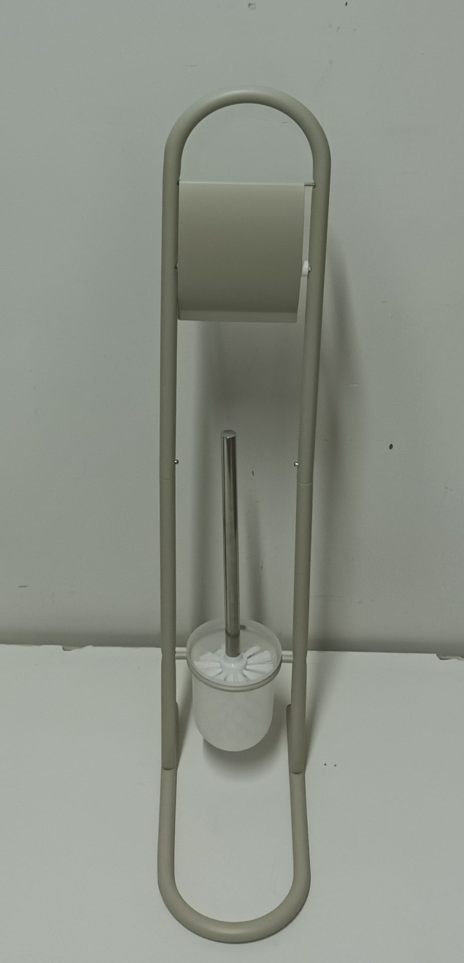 Suporte WC – Rolos e Escova de Piaçaba Bege Fosco Com Pala no Suporte de Papel e copo de Plástico Transparente e Escova com suporte Prata 77*16*30cm