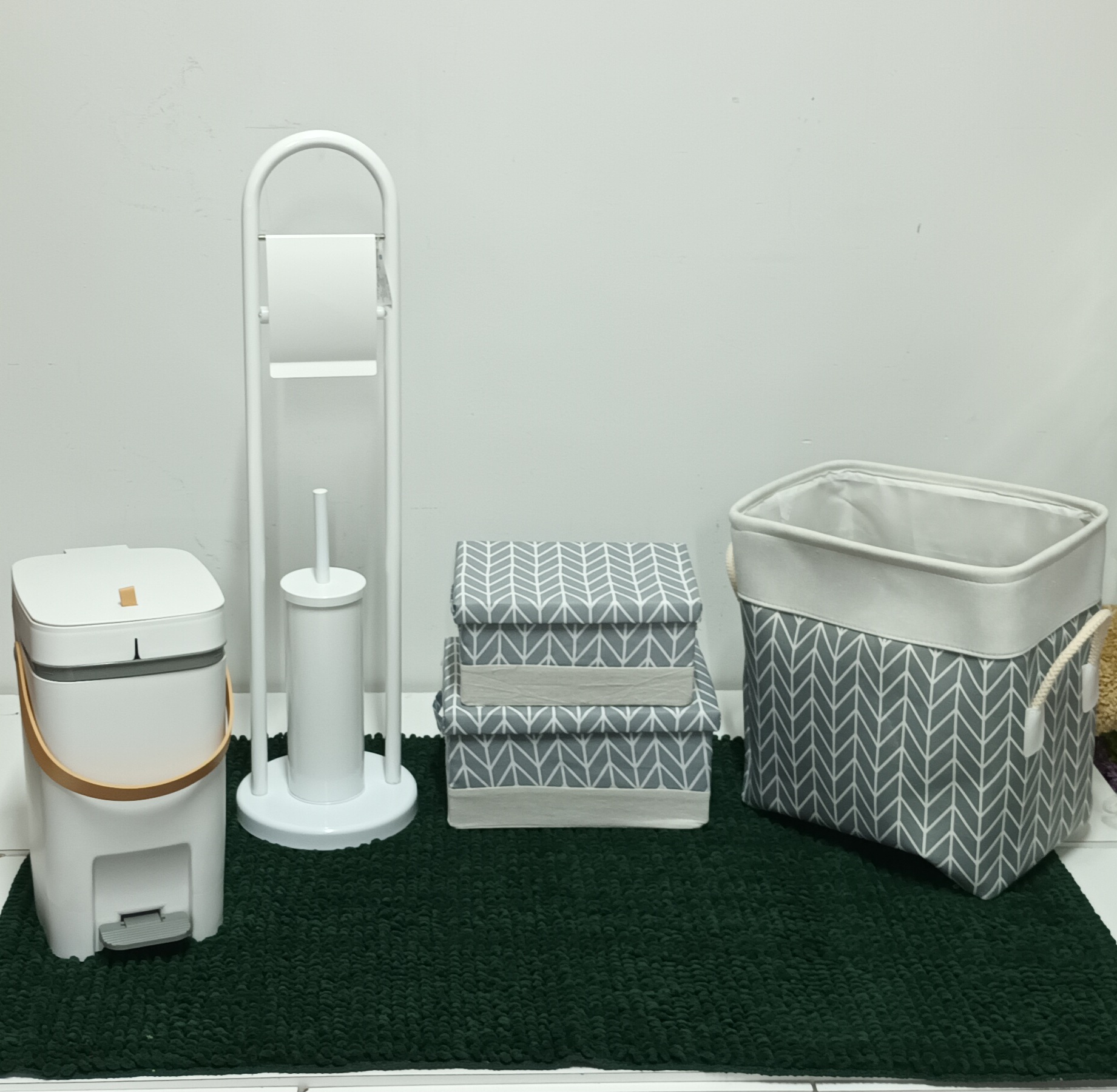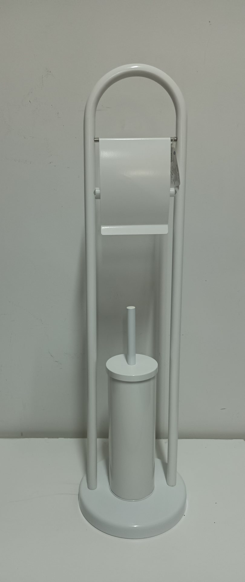 Suporte WC – Rolos e Escova de Piaçaba Metal Branco Fosco com Pala no Suporte do Rolo de Papel 80*17 (Base 23) cm