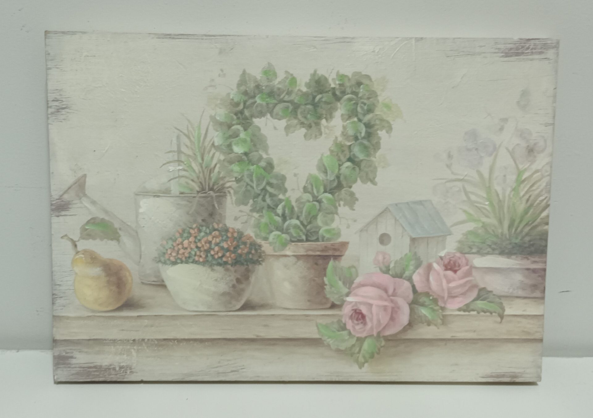 Tela Caixa Madeira Coração com Verdes Com 2 Rosas e Gaiola 50*70cm