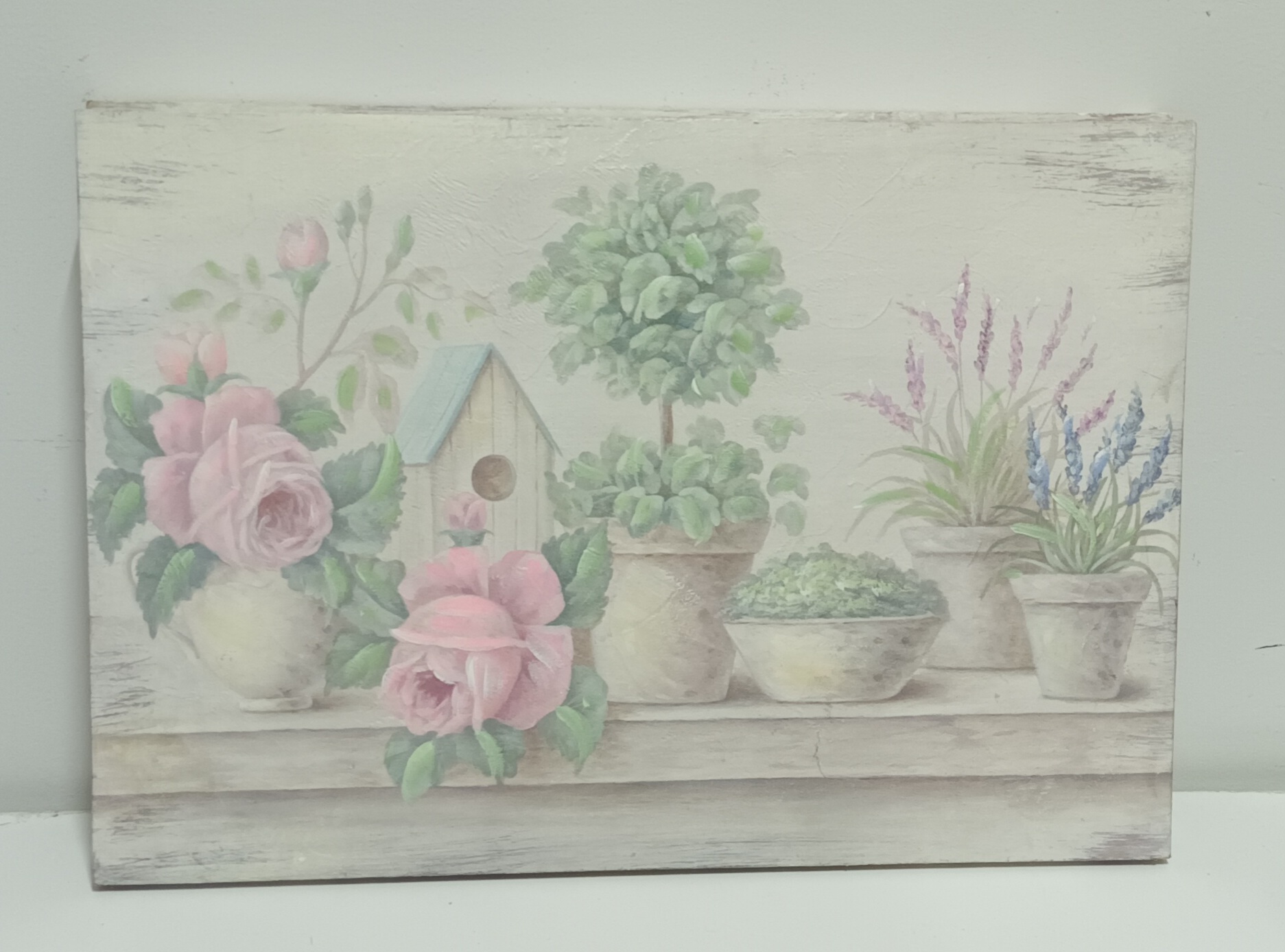 Tela Caixa Madeira Vasos Verdes Com 2 Rosas e Gaiola 36*50cm