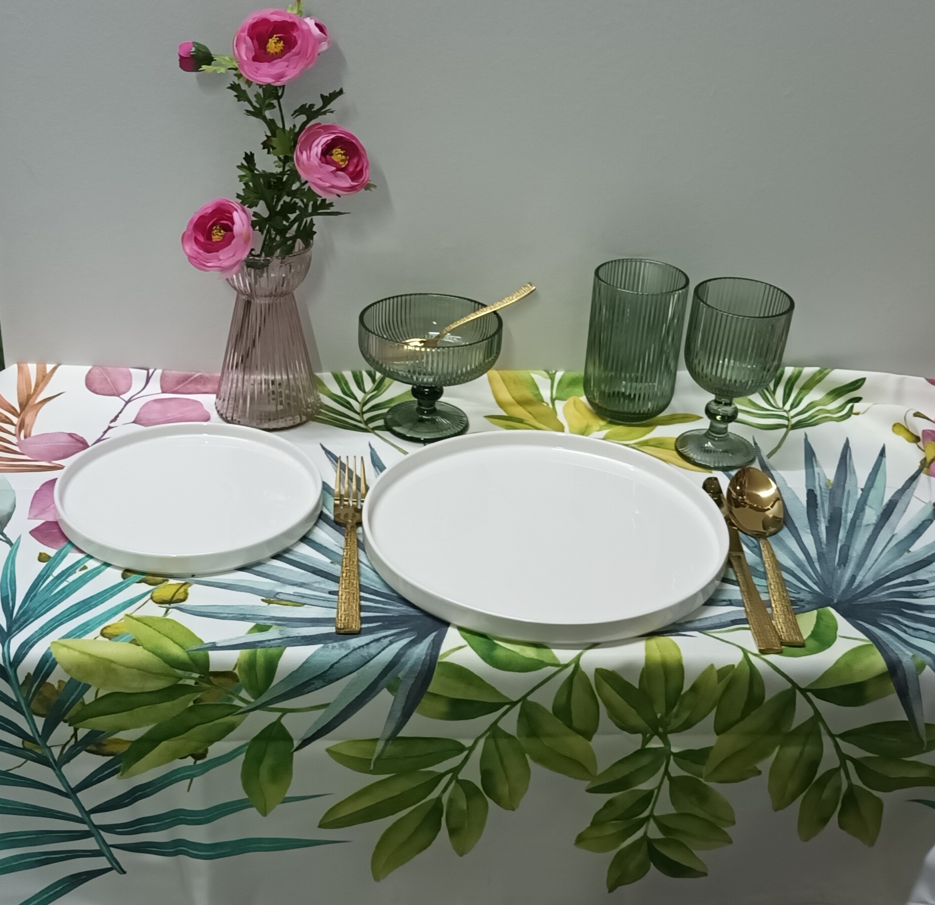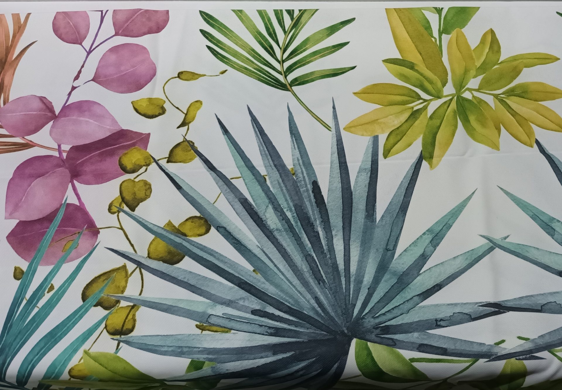 Toalha Antinódoas Branca com Estampagem Folhas Verde/Azul Turquesa/Flores Rosa 145*250