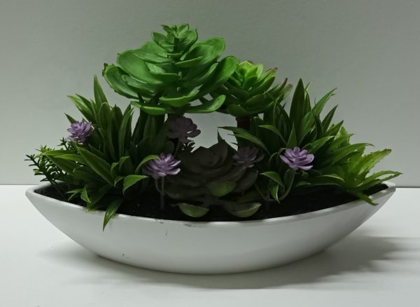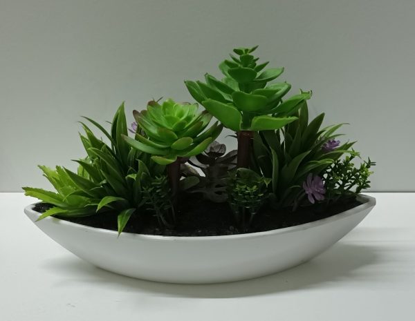 Vaso Plástico em Forma Barco Com Catos e Flôr Lilás 27*10*16cm