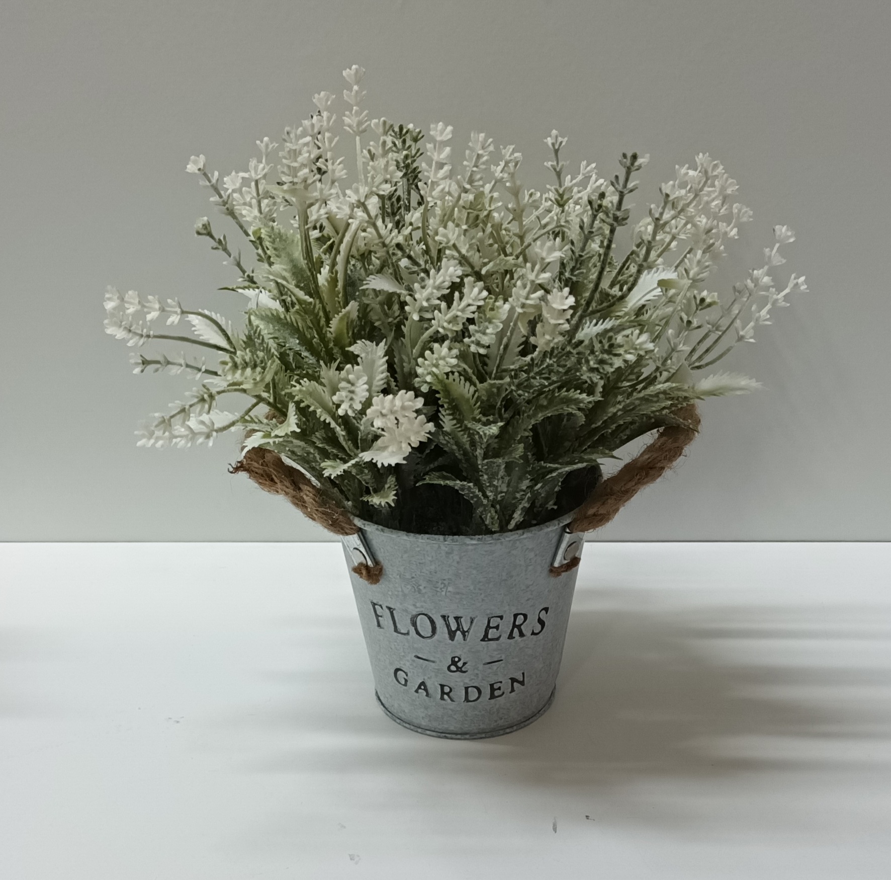 Vaso Metal Branco com Asa Corda e Flôr Lavanda Branca e Verdes 24*17cm