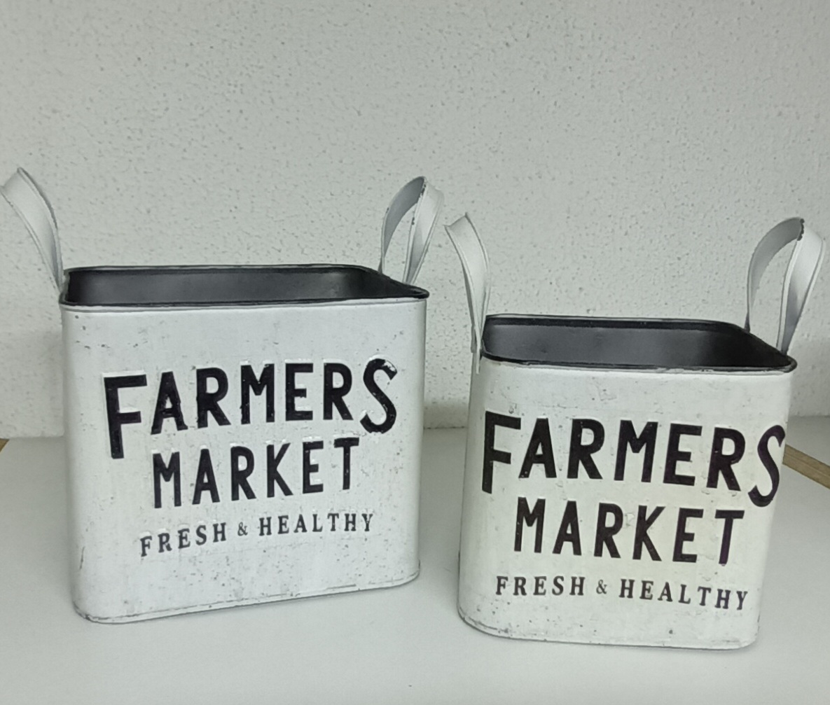Vaso Metal Branco Retangular com asas e Com Letras Pretas – Farmer Market – Pequeno 20*26cm