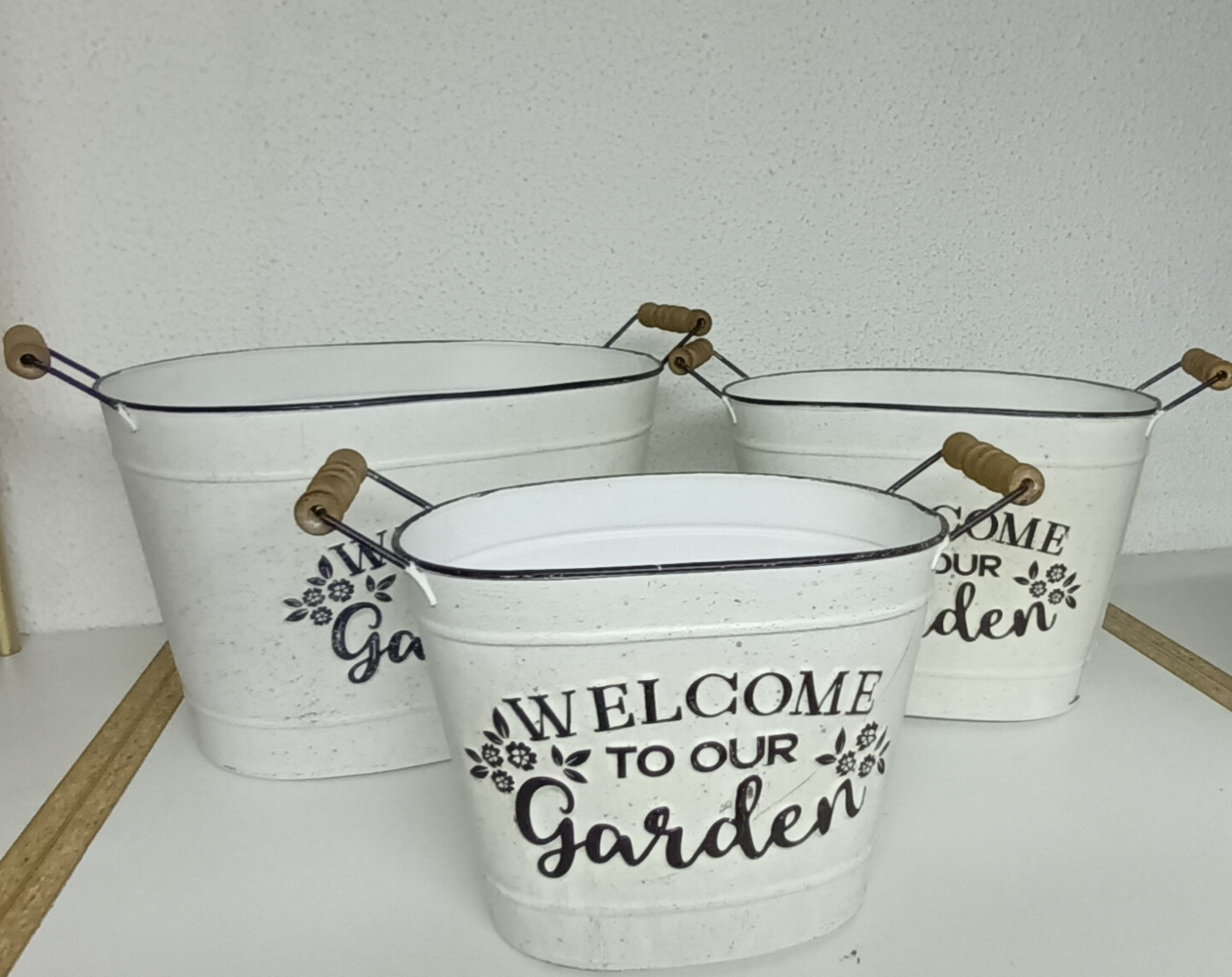 Vaso Metal Branco Oval com asa com Madeira s e Com Letras Pretas – Welcome to Our Garden – Pequeno 32*17*20cm